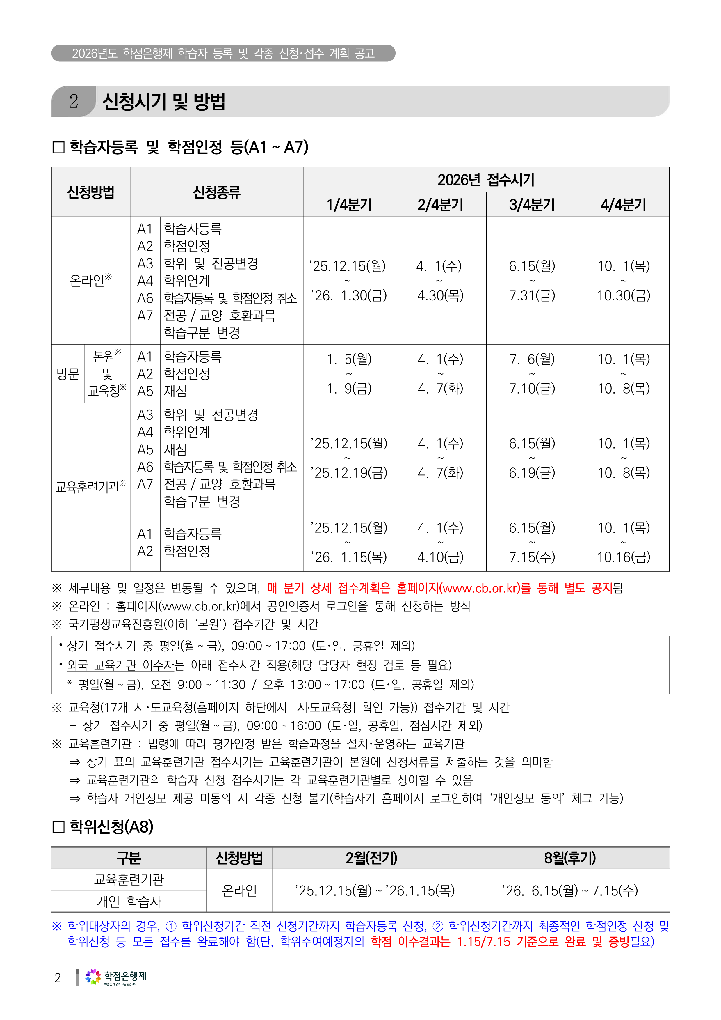 2026년도 학점은행제 학습자 등록 및 각종 신청접수 계획을 아래와 같이 공고합니다.